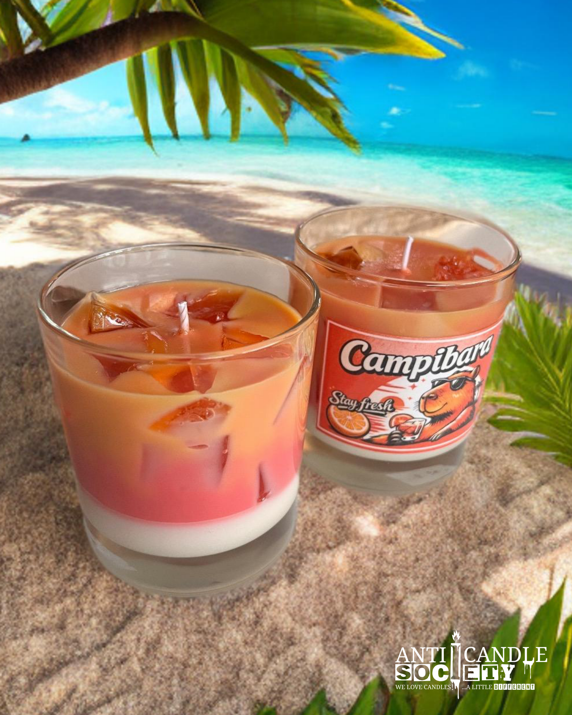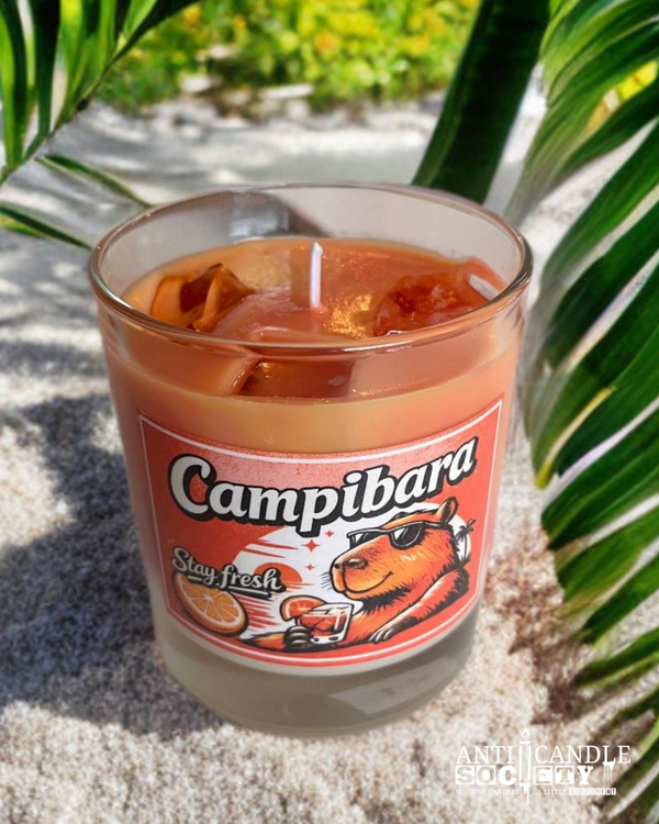 Campibara ist dein persönlicher Sundowner im Glas – ein leuchtender Farbverlauf aus Rot und Orange, Eiswürfel-Optik und entspannter Capybara-Attitude.